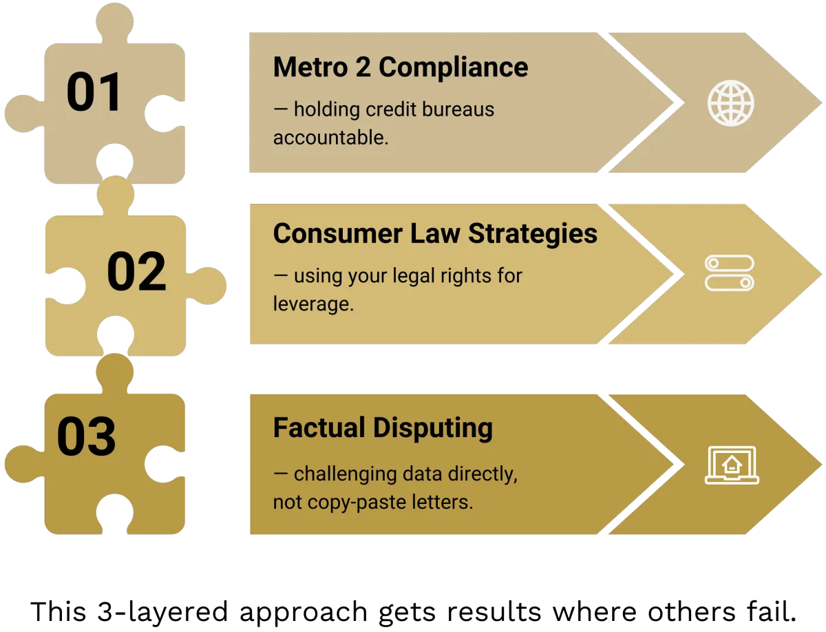 We don’t send cookie-cutter letters. We use Metro 2 compliance, Consumer Law, and Factual Disputing to deliver results — then prepare you for funding so you can move forward with confidence.